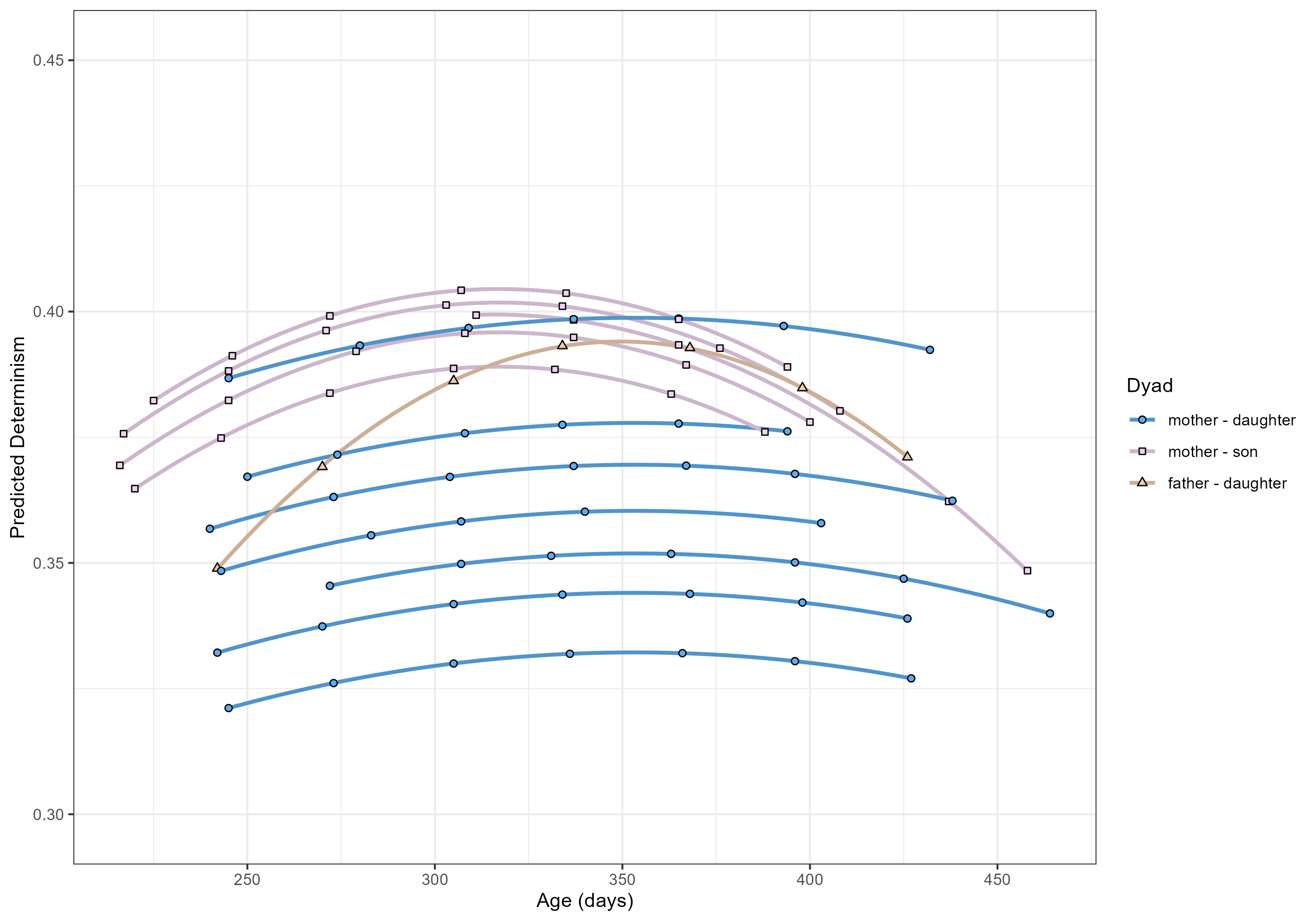 > **Interpretation:** The model revealed significant effects of dyad type and age on determinism measures.