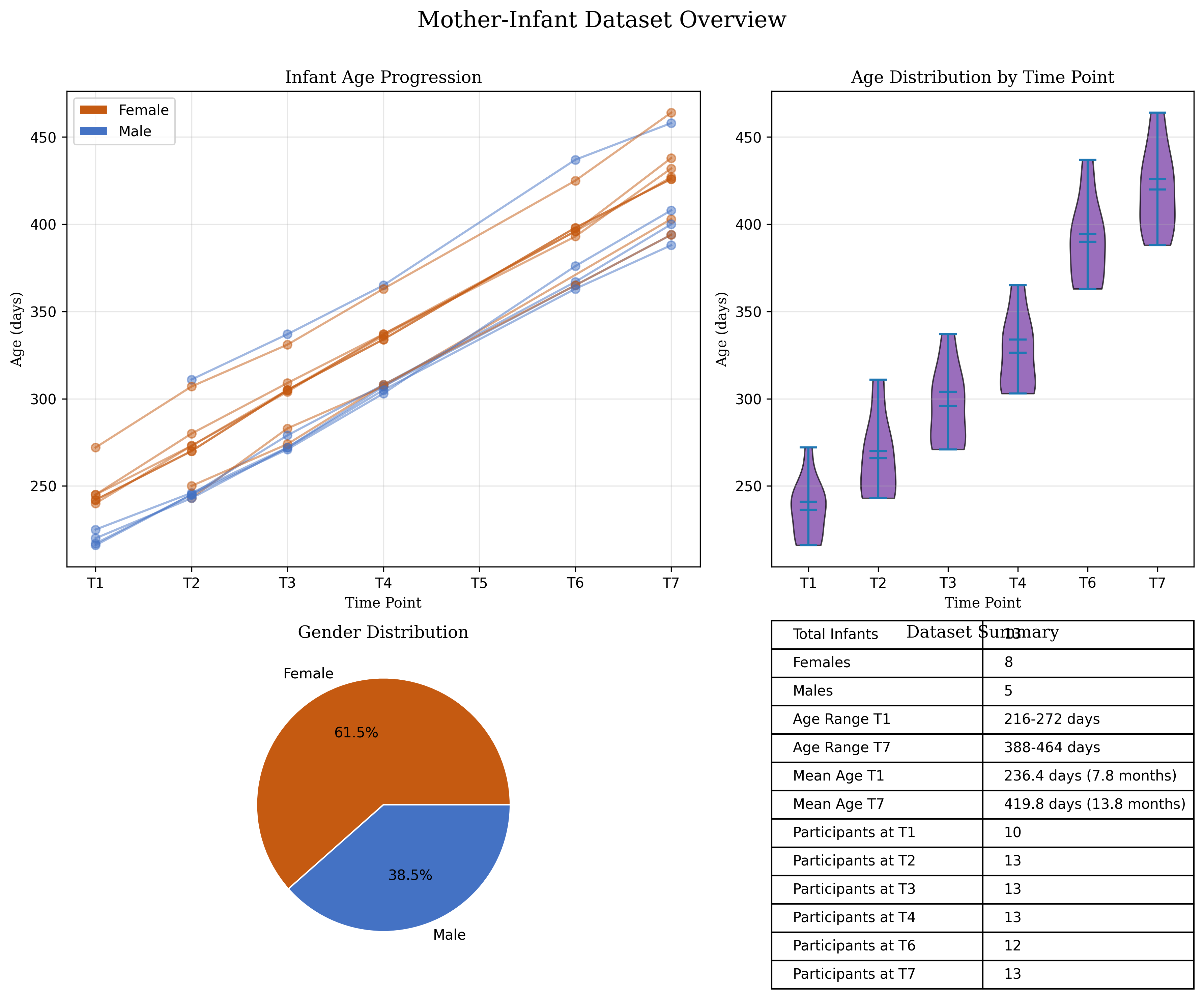 import matplotlibmatplotlib.use('agg')import matplotlib.pyplot as pltplt.ioff()plt.clf() # Clear any existing figuresimport pandas as pdimport numpy as npimport os# Load the datadf = pd.read_csv('./meta/project_point_metadata_ages.csv')# Convert gender to categorical labeldf['gender_label'] = df['gender'].map({0: 'Female', 1: 'Male'})# Create a 2x2 subplot layoutfig, axs = plt.subplots(2, 2, figsize=(12, 10), gridspec_kw={'width_ratios': [1.5, 1], 'height_ratios': [1.5, 1]})fig.suptitle('Caregiver-Infant Dataset Overview', fontsize=16, fontfamily='serif')# Define colors for gendercolors = {'Female': '#C55A11', # Orange for females'Male': '#4472C4'# Blue for males}# 1. Line plot - Age progression across time pointsfor idx, row in df.iterrows(): gender = row['gender_label']# Create arrays for days and time points, handling NaN values days = [] timepoints = []for i inrange(1, 8): # T1 to T7 day_col =f'age_T{i}_days'if day_col in df.columns and pd.notna(row[day_col]) and row[day_col] >0: days.append(row[day_col]) timepoints.append(i)# Plot the line for this infant axs[0, 0].plot( timepoints, days, marker='o', color=colors[gender], alpha=0.5, linewidth=1.5 )# Customize the plotaxs[0, 0].set_xlabel('Time Point', fontfamily='serif')axs[0, 0].set_ylabel('Age (days)', fontfamily='serif')axs[0, 0].set_title('Infant Age Progression', fontfamily='serif')axs[0, 0].set_xticks(range(1, 8))axs[0, 0].set_xticklabels([f'T{i}'for i inrange(1, 8)])axs[0, 0].grid(True, alpha=0.3)# Add legend patchesfrom matplotlib.patches import Patchlegend_elements = [ Patch(facecolor=colors['Female'], edgecolor='w', label='Female'), Patch(facecolor=colors['Male'], edgecolor='w', label='Male')]axs[0, 0].legend(handles=legend_elements, loc='upper left')# 2. Box plot - Age distribution at each time pointtime_point_data = []labels = []for i inrange(1, 8): # T1 to T7 col =f'age_T{i}_days'if col in df.columns: valid_data = df[col].dropna()iflen(valid_data) >0: time_point_data.append(valid_data) labels.append(f'T{i}')# Create violin plotsif time_point_data: violin_parts = axs[0, 1].violinplot( time_point_data, showmeans=True, showmedians=True )# Color the violin plotsfor i, pc inenumerate(violin_parts['bodies']): pc.set_facecolor('#7030A0') # Purple pc.set_edgecolor('black') pc.set_alpha(0.7)# Set labelsaxs[0, 1].set_xticks(range(1, len(labels) +1))axs[0, 1].set_xticklabels(labels)axs[0, 1].set_xlabel('Time Point', fontfamily='serif')axs[0, 1].set_ylabel('Age (days)', fontfamily='serif')axs[0, 1].set_title('Age Distribution by Time Point', fontfamily='serif')axs[0, 1].grid(True, alpha=0.3, axis='y')# 3. Pie chart - Gender distributiongender_counts = df['gender_label'].value_counts()axs[1, 0].pie( gender_counts, labels=gender_counts.index, autopct='%1.1f%%', colors=[colors[g] for g in gender_counts.index], wedgeprops={'edgecolor': 'w', 'linewidth': 1})axs[1, 0].set_title('Gender Distribution', fontfamily='serif')# 4. Summary table# Calculate averages for each time point, handling NaN valuesaverages_days = []for i inrange(1, 8): col =f'age_T{i}_days'if col in df.columns: avg = df[col].mean()ifnot pd.isna(avg): avg_months = avg /30.44# Convert to months averages_days.append([f"T{i} Average Age", f"{avg:.1f} days ({avg_months:.1f} months)"])# Count participants at each time pointparticipants = []for i inrange(1, 8): col =f'age_T{i}_days'if col in df.columns: count = df[col].notna().sum() participants.append([f"Participants at T{i}", f"{count}"])# Overall statisticssummary_data = [ ["Total Infants", f"{len(df)}"], ["Females", f"{(df['gender'] ==0).sum()}"], ["Males", f"{(df['gender'] ==1).sum()}"]]# Add age ranges if columns existif'age_T1_days'in df.columns: summary_data.append(["Age Range T1", f"{df['age_T1_days'].min():.0f}-{df['age_T1_days'].max():.0f} days"])last_tp =7while last_tp >0: col =f'age_T{last_tp}_days'if col in df.columns and df[col].notna().sum() >0: summary_data.append([f"Age Range T{last_tp}", f"{df[col].min():.0f}-{df[col].max():.0f} days"])break last_tp -=1# Age mean if'age_T1_days'in df.columns: summary_data.append(["Mean Age T1", f"{df['age_T1_days'].mean():.1f} days ({df['age_T1_days'].mean()/30.44:.1f} months)"])if last_tp >0: col =f'age_T{last_tp}_days'if col in df.columns: summary_data.append([f"Mean Age T{last_tp}", f"{df[col].mean():.1f} days ({df[col].mean()/30.44:.1f} months)"])# Create the table with the most important summary statisticsaxs[1, 1].axis('off')table = axs[1, 1].table( cellText=summary_data + participants, loc='center', cellLoc='left')table.auto_set_font_size(False)table.set_fontsize(10)table.scale(1, 1.5)axs[1, 1].set_title('Dataset Summary', fontfamily='serif')plt.tight_layout()plt.subplots_adjust(top=0.9)# Save the figure to a fileoutput_path ="images/mother_infant_analysis.png"os.makedirs(os.path.dirname(output_path), exist_ok=True)plt.savefig(output_path, dpi=300, bbox_inches='tight')plt.close(fig) # Explicitly close the figure object