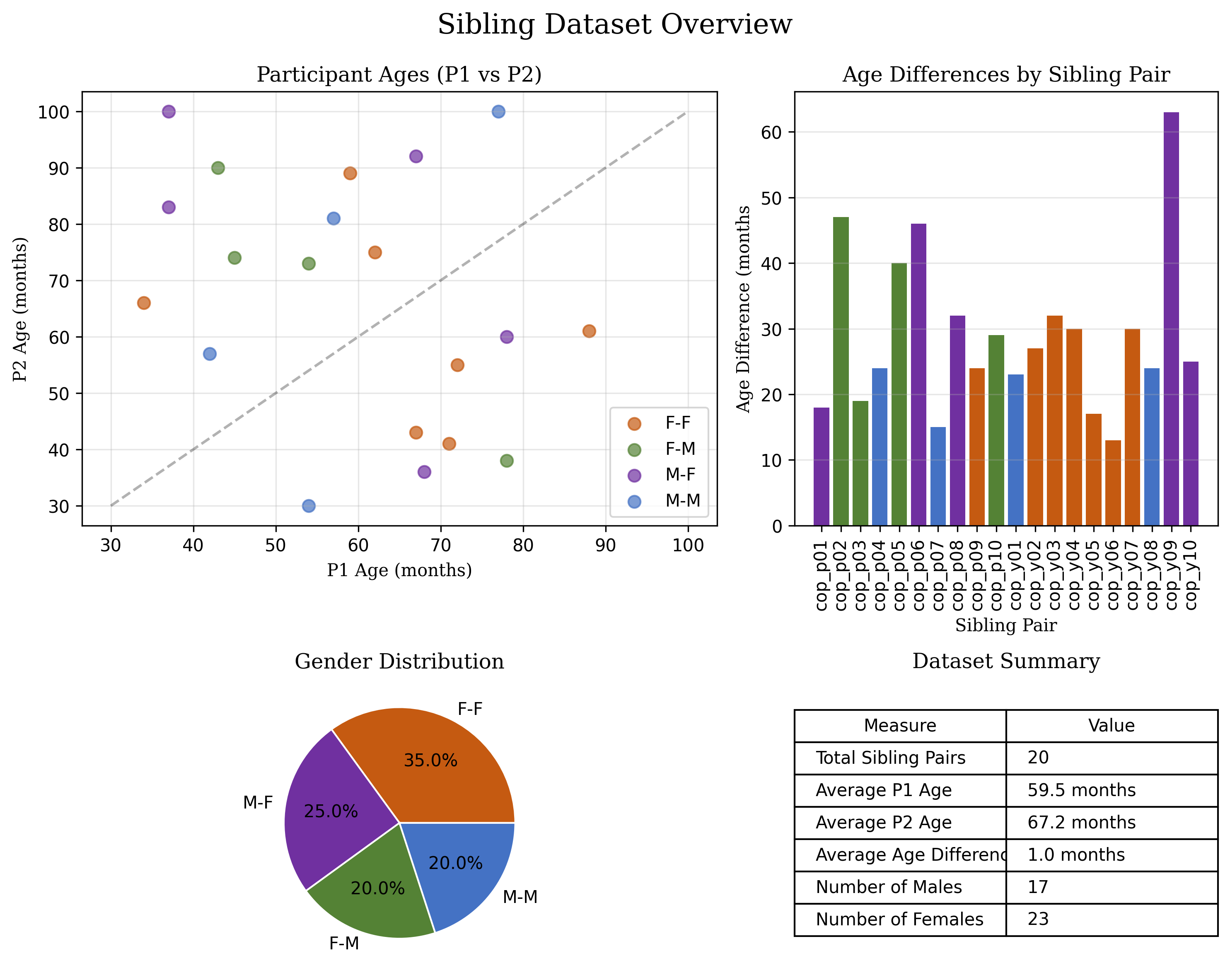 import pandas as pdimport matplotlib.pyplot as pltimport numpy as npimport os# Load the datadf = pd.read_csv('./meta/project_siblings_metadata_ages_gender.csv')# Data preprocessingdf['AgeDifference'] =abs(df['P1agemonths'] - df['P2agemonths'])df['AverageAge'] = (df['P1agemonths'] + df['P2agemonths']) /2df['GenderCombo'] = df['GenderP1'] +'-'+ df['GenderP2']# Create a 2x2 subplot layoutfig, axs = plt.subplots(2, 2, figsize=(10, 8), gridspec_kw={'width_ratios': [1.5, 1], 'height_ratios': [1.5, 1]})fig.suptitle('Sibling Dataset Overview', fontsize=16, fontfamily='serif')# Define colors for gender combinationscolors = {'M-M': '#4472C4', # Blue'M-F': '#7030A0', # Purple'F-M': '#548235', # Green'F-F': '#C55A11'# Rust/Orange}# 1. Scatter plot - P1 age vs P2 agefor gender_combo, group in df.groupby('GenderCombo'): axs[0, 0].scatter( group['P1agemonths'], group['P2agemonths'], color=colors.get(gender_combo, 'gray'), alpha=0.7, label=gender_combo, s=50 )# Add reference linemin_age =min(df['P1agemonths'].min(), df['P2agemonths'].min())max_age =max(df['P1agemonths'].max(), df['P2agemonths'].max())axs[0, 0].plot([min_age, max_age], [min_age, max_age], 'k--', alpha=0.3)axs[0, 0].set_xlabel('P1 Age (months)', fontfamily='serif')axs[0, 0].set_ylabel('P2 Age (months)', fontfamily='serif')axs[0, 0].set_title('Participant Ages (P1 vs P2)', fontfamily='serif')axs[0, 0].grid(True, alpha=0.3)axs[0, 0].legend()# 2. Bar chart - Age differencesbar_positions = np.arange(len(df))bar_width =0.8axs[0, 1].bar( bar_positions, df['AgeDifference'], width=bar_width, color=[colors.get(combo, 'gray') for combo in df['GenderCombo']])axs[0, 1].set_xticks(bar_positions)axs[0, 1].set_xticklabels(df['Code'], rotation=90)axs[0, 1].set_xlabel('Sibling Pair', fontfamily='serif')axs[0, 1].set_ylabel('Age Difference (months', fontfamily='serif')axs[0, 1].set_title('Age Differences by Sibling Pair', fontfamily='serif')axs[0, 1].grid(True, alpha=0.3, axis='y')# 3. Pie chart - Gender distributiongender_counts = df['GenderCombo'].value_counts()axs[1, 0].pie( gender_counts, labels=gender_counts.index, autopct='%1.1f%%', colors=[colors.get(combo, 'gray') for combo in gender_counts.index], wedgeprops={'edgecolor': 'w', 'linewidth': 1})axs[1, 0].set_title('Gender Distribution', fontfamily='serif')# 4. Summary tablesummary_data = [ ["Total Sibling Pairs", f"{len(df)}"], ["Average P1 Age", f"{df['P1agemonths'].mean()} months"], ["Average P2 Age", f"{df['P2agemonths'].mean()} months"], ["Average Age Difference", f"{df['AgeDifference'].mean()/30:.1f} months"], ["Number of Males", f"{(df['GenderP1'] =='M').sum() + (df['GenderP2'] =='M').sum()}"], ["Number of Females", f"{(df['GenderP1'] =='F').sum() + (df['GenderP2'] =='F').sum()}"]]# Turn off axis for tableaxs[1, 1].axis('off')table = axs[1, 1].table( cellText=[row for row in summary_data], colLabels=["Measure", "Value"], loc='center', cellLoc='left')table.auto_set_font_size(False)table.set_fontsize(10)table.scale(1, 1.5)axs[1, 1].set_title('Dataset Summary', fontfamily='serif')plt.tight_layout()plt.subplots_adjust(top=0.9)# Save the figure to a fileoutput_path ="images/sibling_analysis.png"os.makedirs(os.path.dirname(output_path), exist_ok=True)plt.savefig(output_path, dpi=300, bbox_inches='tight')plt.close()