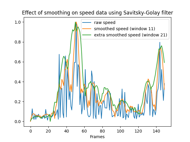 import pandas as pdimport numpy as npimport glob as globimport osimport scipy.signalimport matplotlib.pyplot as pltdef normalize_array(arr):"""Normalize an array to the range [0, 1]"""return (arr - np.min(arr)) / (np.max(arr) - np.min(arr))folderstep12output ="./dataoutput_STEP1_2_timeseries/"# Load the CSV filecsv_file = glob.glob(os.path.join(folderstep12output +"*.csv"))[0]df = pd.read_csv(csv_file)# get raw speed valuesraw_speed = df['wrist_left_p1_speed'].values# smooth the speed timeseriesspeed = scipy.signal.savgol_filter(raw_speed, window_length=11, polyorder=3)# comparison smoothingextra_speed = scipy.signal.savgol_filter(raw_speed, window_length=21, polyorder=3)plt.plot(normalize_array(raw_speed[0:150]))plt.plot(normalize_array(speed[0:150]))plt.plot(normalize_array(extra_speed[0:150]))plt.title("Effect of smoothing on speed data using Savitsky-Golay filter")plt.xlabel("Frames")plt.legend(labels=["raw speed","smoothed speed (window 11)", "extra smoothed speed (window 21)"])#plt.show()# save the plotplt.savefig("images/smoothing_speed_effect.png")plt.close()