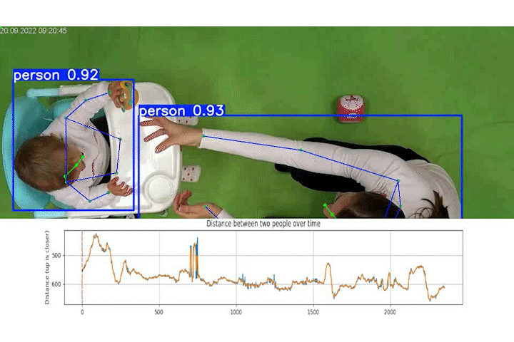 Thirteen infant-caregiver pairs visited the child laboratory monthly for a total of seven visits. The infants’ ages at the first visit ranged from 7 to 9 months. Parents were instructed to “play as usual,” with a set of different toys to encourage spontaneous interactions. Each visit lasted approximately 30 minutes and was divided into four stages. For our analyses, we focus on recordings from the stage where the infant was seated in a feeding chair, facing the caregiver sitting directly across. This controlled setup minimizes movement around the room, facilitating video motion tracking analysis. Additionally, our analyses are restricted to top-view recordings, ensuring that both the caregiver and the infant are captured within a single frame.