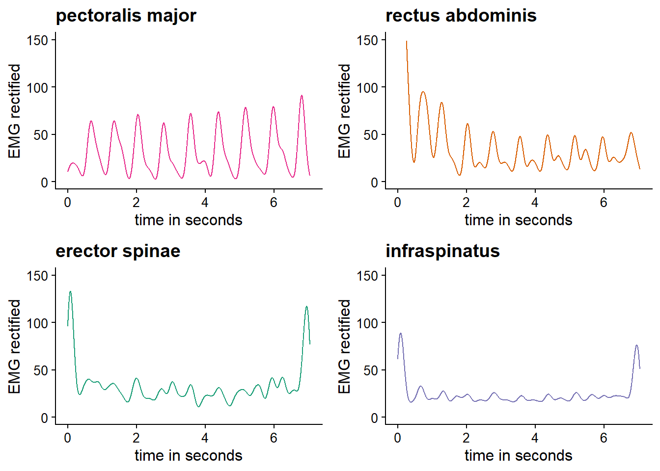 #show another example, now from no movement condition#we use p18, trial 73#grep("p18_trial_73_BrainAmpSeries-Dev_1.csv", EMGdata)emgdnomov <-read.csv(paste0(rawd, EMGdata[824]))colnames(emgdnomov) <-c('time_s', 'infraspinatus', 'rectus_abdominis', 'pectoralis_major', 'erector_spinae', 'empty1', 'empty2', 'empty3', 'empty4', 'respiration_belt', 'button_box')samplingrate <-1/mean(diff(emgdnomov$time_s))nyquistemg <- samplingrate/2emgdnomov$time_s <- emgdnomov$time_s-min(emgdnomov$time_s) # normalize time#example with high-pass filter at 0.75 and low-pass filter 3 Hz# cutoffhigh = high-pass filter, cutofflow = low-pass filteremgdnomov$pectoralis_major_sm_h <-reclow.it(emgdnomov$pectoralis_major, samplingrate= samplingrate, cutoffhigh =0.75, cutofflow =3) emgdnomov$infraspinatus_sm_h <-reclow.it(emgdnomov$infraspinatus, samplingrate= samplingrate, cutoffhigh =0.75, cutofflow =3) emgdnomov$erector_spinae_sm_h <-reclow.it(emgdnomov$erector_spinae, samplingrate= samplingrate, cutoffhigh =0.75, cutofflow =3) emgdnomov$rectus_abdominis_sm_h <-reclow.it(emgdnomov$rectus_abdominis, samplingrate= samplingrate, cutoffhigh =0.75, cutofflow =3) #example trialfilteredEMGnomov <-ggplot(emgdnomov[seq(1, nrow(emgdnomov),by=5),], aes(x=time_s)) +geom_path(aes(y=infraspinatus_sm_h, color ='infraspinatus')) +geom_path(aes(y=pectoralis_major_sm_h, color ='pectoralis major')) +geom_path(aes(y=rectus_abdominis_sm_h, color ='rectus abdominis')) +geom_path(aes(y=erector_spinae_sm_h, color ='erector spinae')) +ggtitle('Filtered EMG, 0.75-3 Hz') +scale_color_manual(values = colors_mus)filteredEMGnomov <- filteredEMGnomov +labs(x ="time in seconds", y ="EMG rectified", color ="Legend") +xlab('time in seconds') +ylab('EMG rectified') +theme_cowplot(12) +theme(legend.position ="right")filteredEMGnomovinfra <-ggplot(emgdnomov[seq(1, nrow(emgdnomov),by=5),], aes(x=time_s)) +geom_path(aes(y=infraspinatus_sm_h, color ='infraspinatus')) +ggtitle('infraspinatus') +scale_color_manual(values = colors_mus) +labs(x ="time in seconds", y ="EMG rectified", color ="Legend") +xlab('time in seconds') +ylab('EMG rectified') +ylim(0, 150) +theme_cowplot(12) +theme(legend.position ="none")filteredEMGnomovpec <-ggplot(emgdnomov[seq(1, nrow(emgdnomov),by=5),], aes(x=time_s)) +geom_path(aes(y=pectoralis_major_sm_h, color ='pectoralis major')) +ggtitle('pectoralis major') +scale_color_manual(values = colors_mus) +labs(x ="time in seconds", y ="EMG rectified", color ="Legend") +xlab('time in seconds') +ylab('EMG rectified') +ylim(0, 150) +theme_cowplot(12) +theme(legend.position ="none")filteredEMGnomovrectus <-ggplot(emgdnomov[seq(1, nrow(emgdnomov),by=5),], aes(x=time_s)) +geom_path(aes(y=rectus_abdominis_sm_h, color ='rectus abdominis')) +ggtitle('rectus abdominis') +scale_color_manual(values = colors_mus) +labs(x ="time in seconds", y ="EMG rectified", color ="Legend") +xlab('time in seconds') +ylab('EMG rectified') +ylim(0, 150) +theme_cowplot(12) +theme(legend.position ="none")filteredEMGnomoverector <-ggplot(emgdnomov[seq(1, nrow(emgdnomov),by=5),], aes(x=time_s)) +geom_path(aes(y=erector_spinae_sm_h, color ='erector spinae')) +ggtitle('erector spinae') +scale_color_manual(values = colors_mus) +labs(x ="time in seconds", y ="EMG rectified", color ="Legend") +xlab('time in seconds') +ylab('EMG rectified') +ylim(0, 150) +theme_cowplot(12) +theme(legend.position ="none")