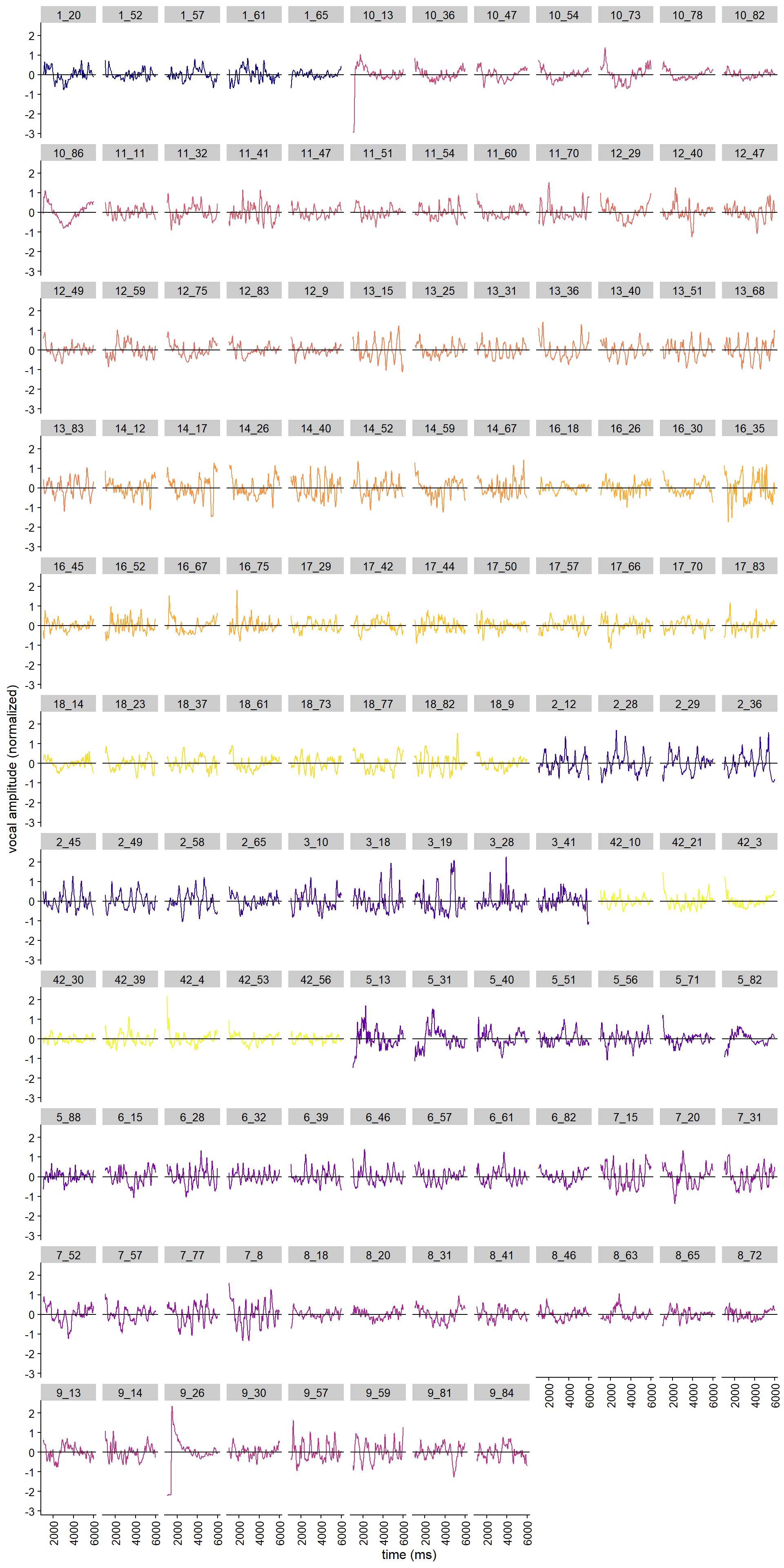 Note that there is a general decline in the amplitude of the vocalization during a trial (see Fig. @ref(fig:combinedtimeseries), top panel). This is to be expected, as the subglottal pressure falls when the lungs deflate. To quantify deviations from stable vocalizations, we therefore detrended the amplitude envelope time series, so as to assess positive or negative peaks relative to this trend line.