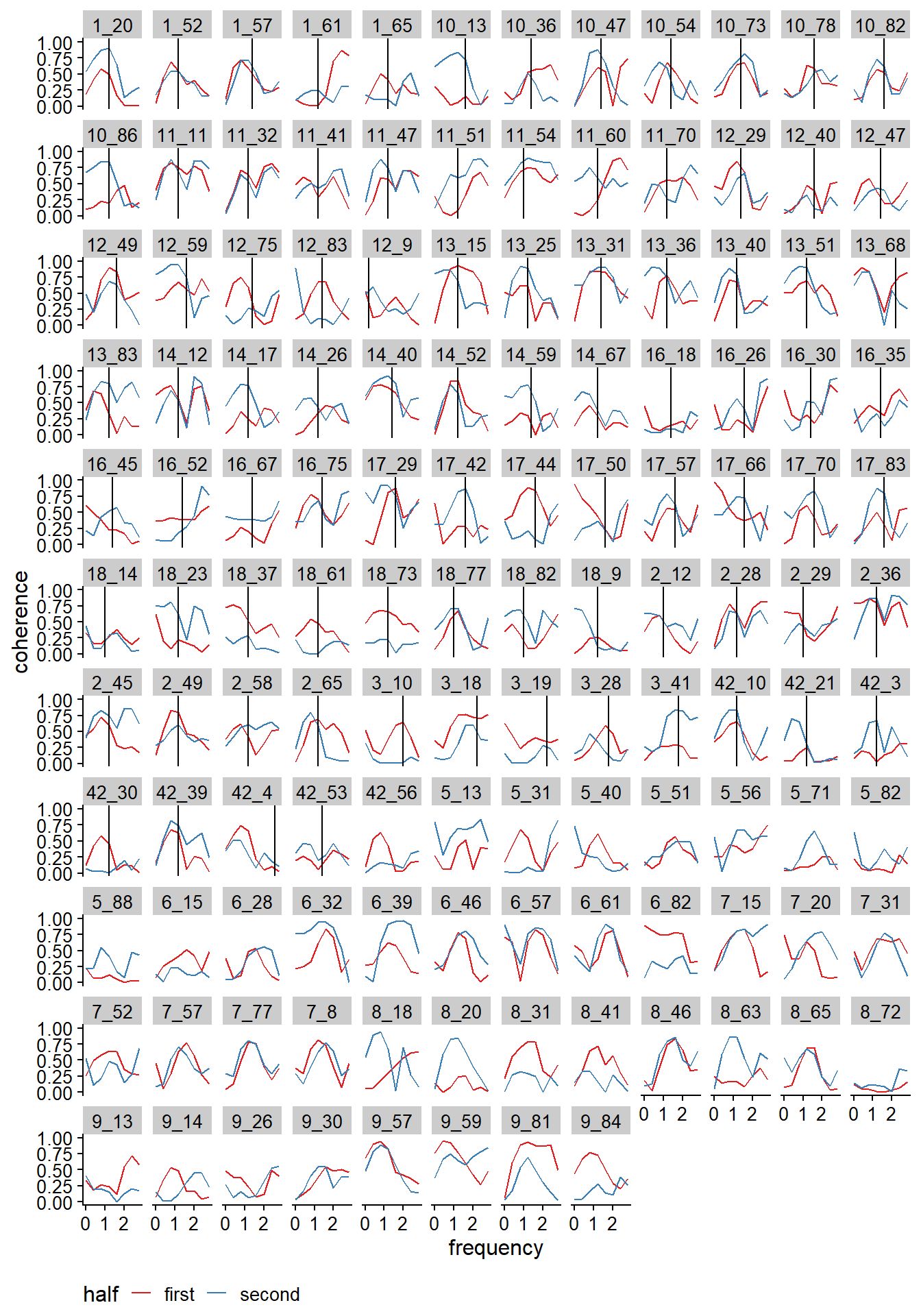 Next, we plotted the coherence spectrums for real and false pairs (see Fig. @ref(fig:coherencepairsplot)) for all trials. In the plots, separated by trial, we inserted a vertical line that represents the heart rate that we extracted from the FFTs of the EMG signal.