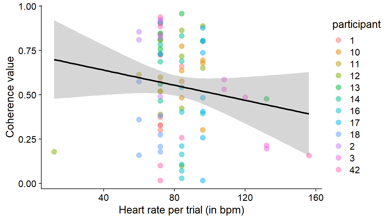 #convert heartrate from Hz to bpmheartrate_coh <- heartrate_coh %>%mutate(heartrate_bpm = heartrate_hz *60)#create participant column from IDheartrate_coh$participant <-sub("_(.*)", "", heartrate_coh$ID)#plot the relationshipcorrelation_coherence_heartrate <-ggplot(heartrate_coh, aes(y = coherence, color = participant)) +geom_point(aes(x = heartrate_bpm), size =3, alpha =0.5) +geom_smooth(aes(x = heartrate_bpm), color ='black', method ='lm') +theme_bw() +ylab('Coherence value') +xlab('Heart rate per trial (in bpm)') +theme_cowplot()