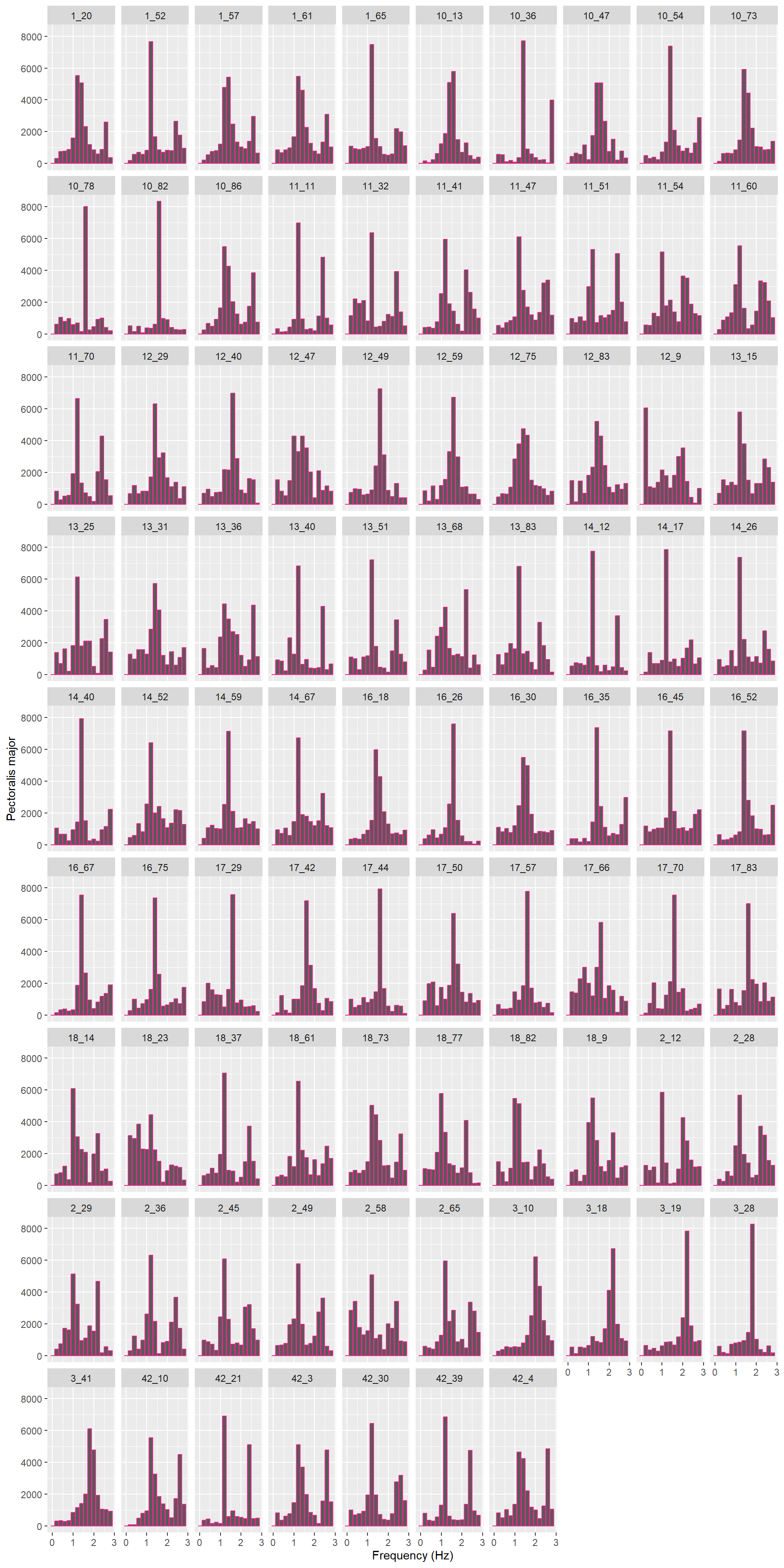 All spectra for the pectoralis major sEMG signals (via FFT) by all participants shown in one plot..
