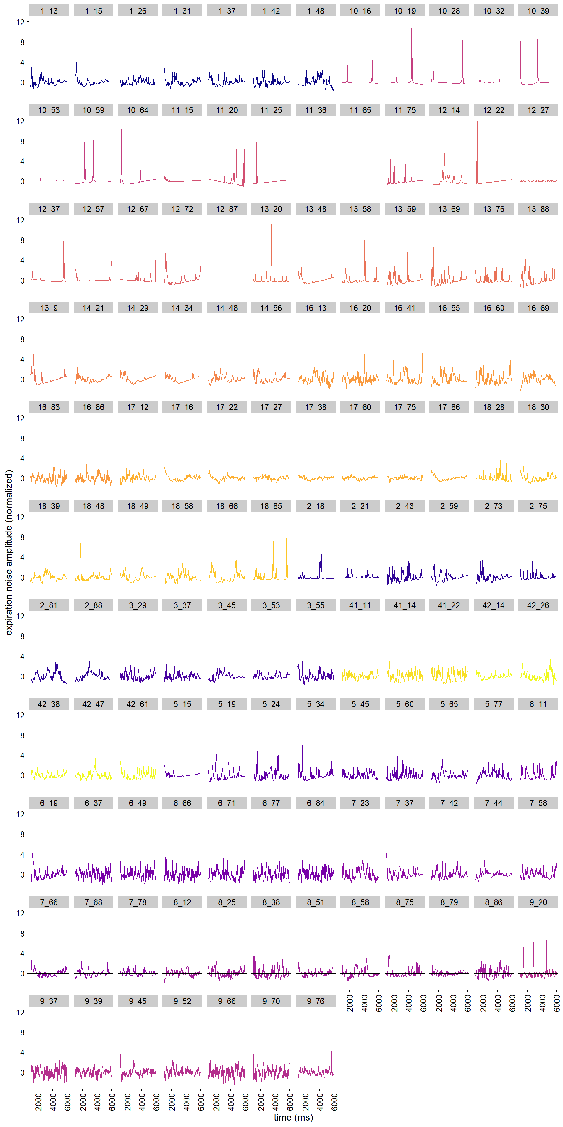 We found the median value of the distance between velocity peak and the closest peak in the EMG signal to be NA ms, with a standard deviation of NA ms. We computed that by subtracting the timing of the onset of vocalization from the timing of the closest EMG peak/heart beat. This way, positive values in the distance could be interpreted as the closes heart beat occuring later than the onset of vocalization. But first, we visualized the peaks to see if they are sensible.
